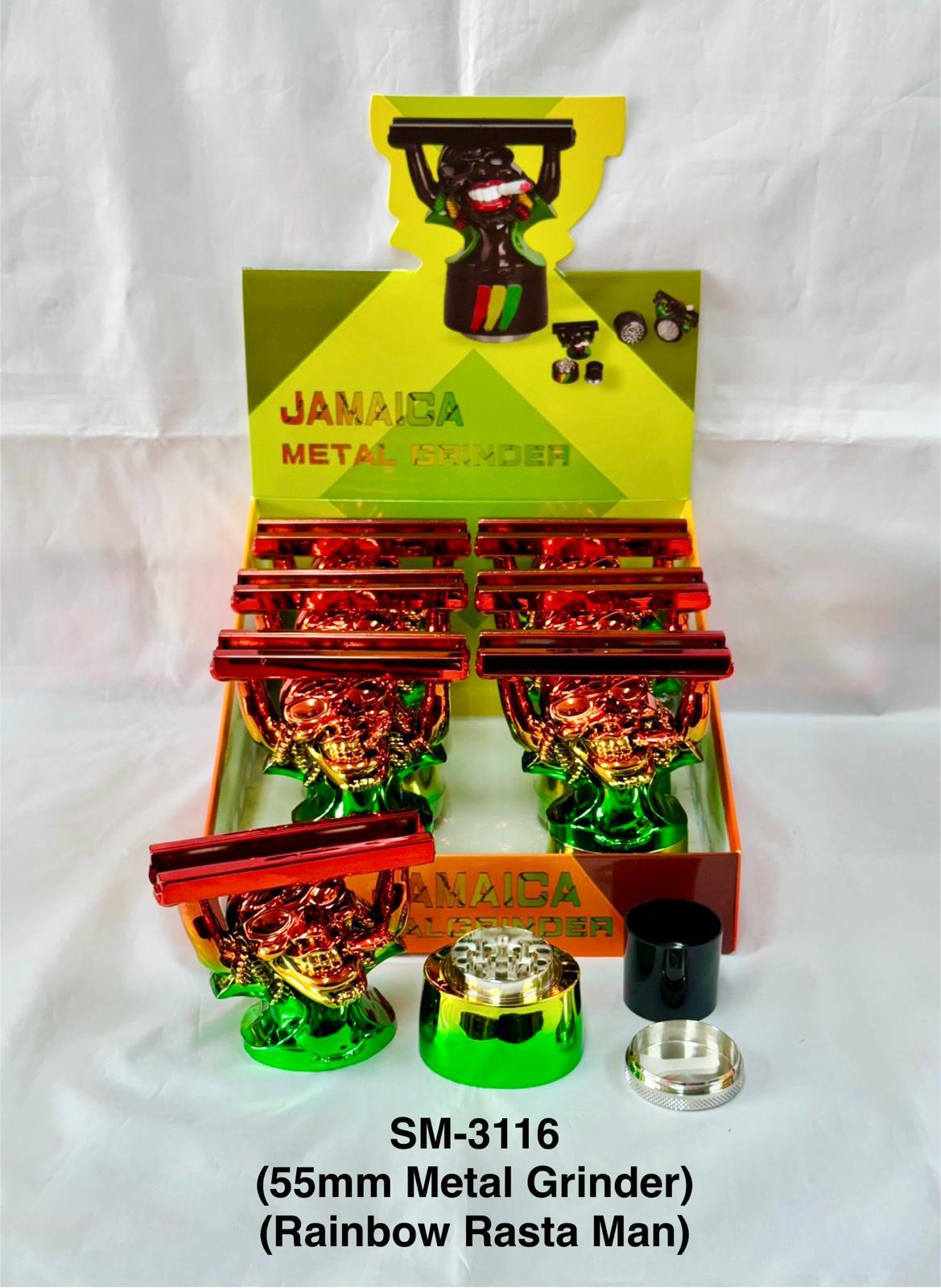 The Rasta Man Metal Grinder (55mm) is a high-quality herb grinder featuring a durable metal construction and a compact yet efficient design. It comes in three different Rasta-themed designs, often showcasing vibrant red, yellow, and green colors, along with classic Rasta imagery such as Lion of Judah, Bob Marley, or a smoking Rastafarian.