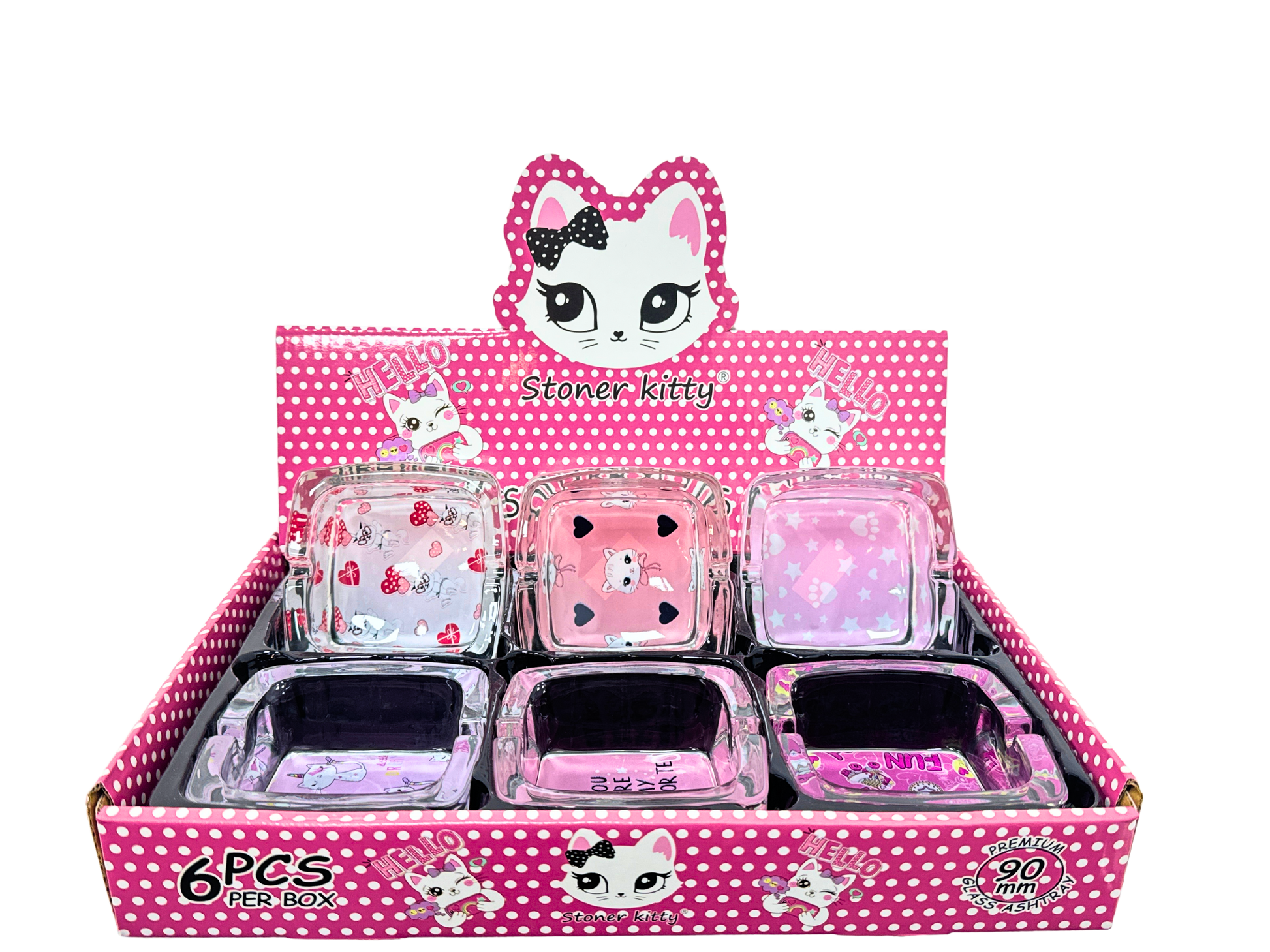 These glass ashtrays are in square shape. Contains 6 ashtrays, each one has a different print design and all are in pink stoner kitty theme. Made of high quality glass